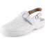 Sandál, kožený s plnou špicí, perforovaný s přezkou na suchý zip a páskem kolem paty. Svršek z přírodní usně, PU podešev.
